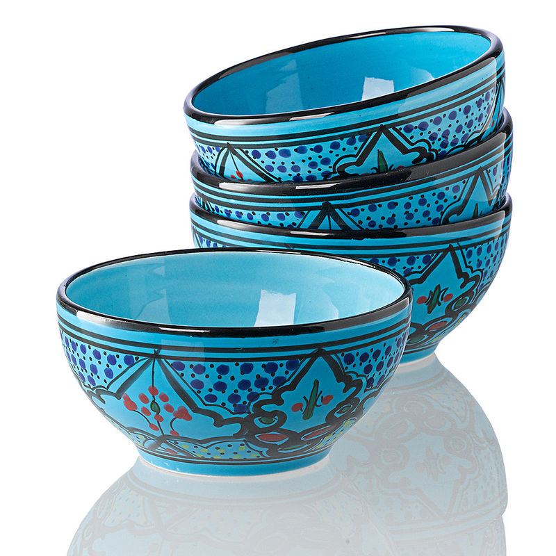 vaisselle orientale faite main en céramique dure Le décor sophistiqué est appliqué á la main dans une petite manufacture tunisienne. La couleur turquoise rappelle la Méditerranée. Chaque pièce est unique.